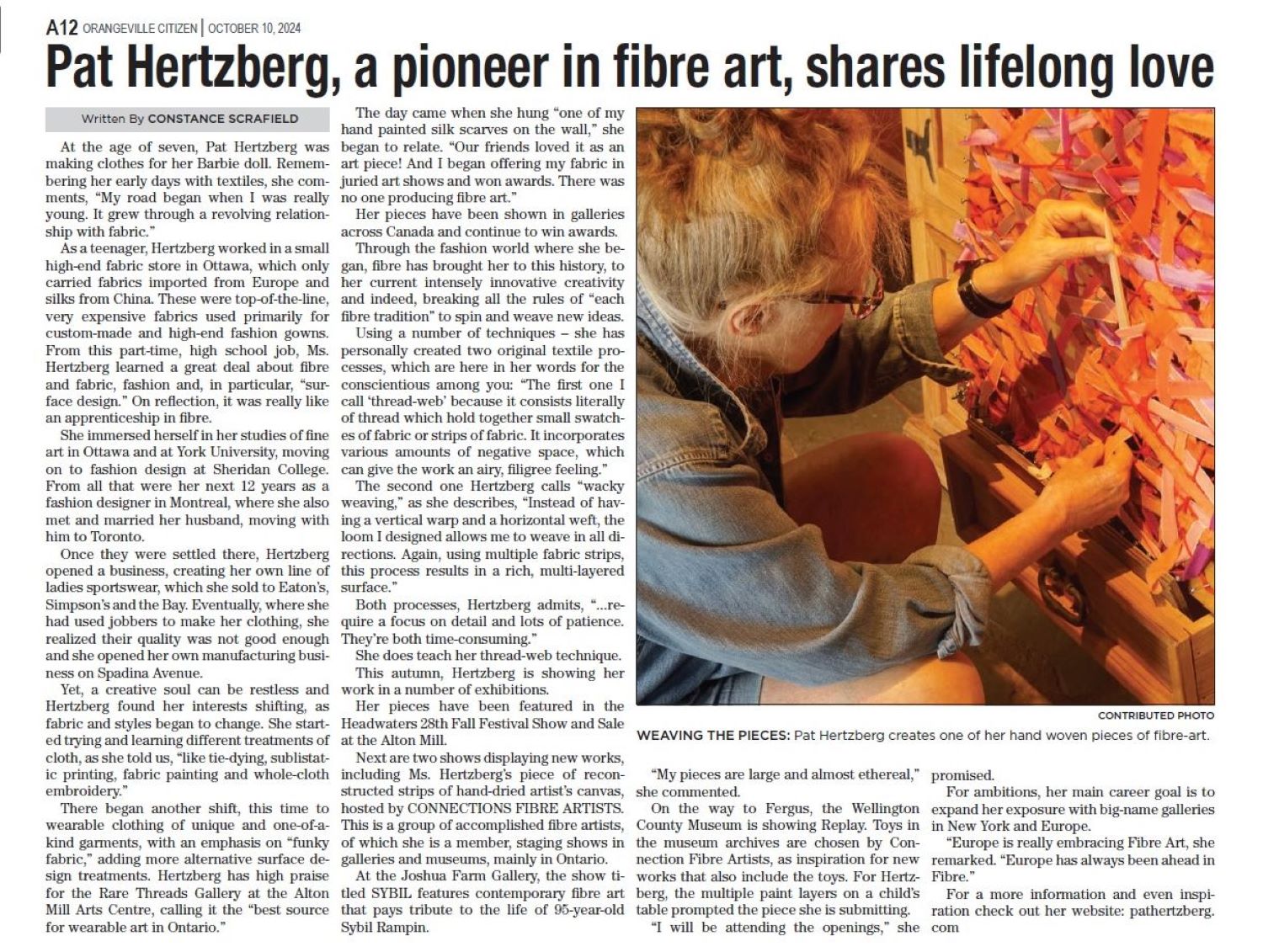 An article about Pat's interesting career in fibre was written by Constance Scrafield in the October 10, 2024 Orangeville Citizen.